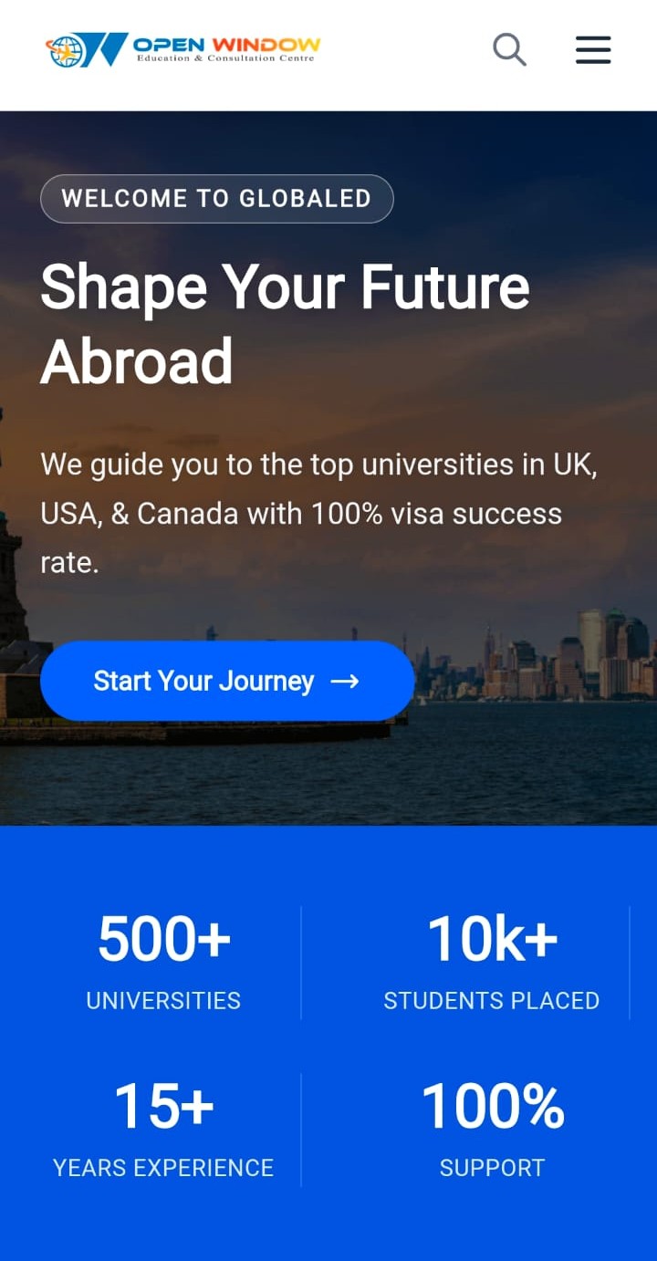 A modern, responsive website for an education consultancy, showcasing services, partner universities, and student testimonials.